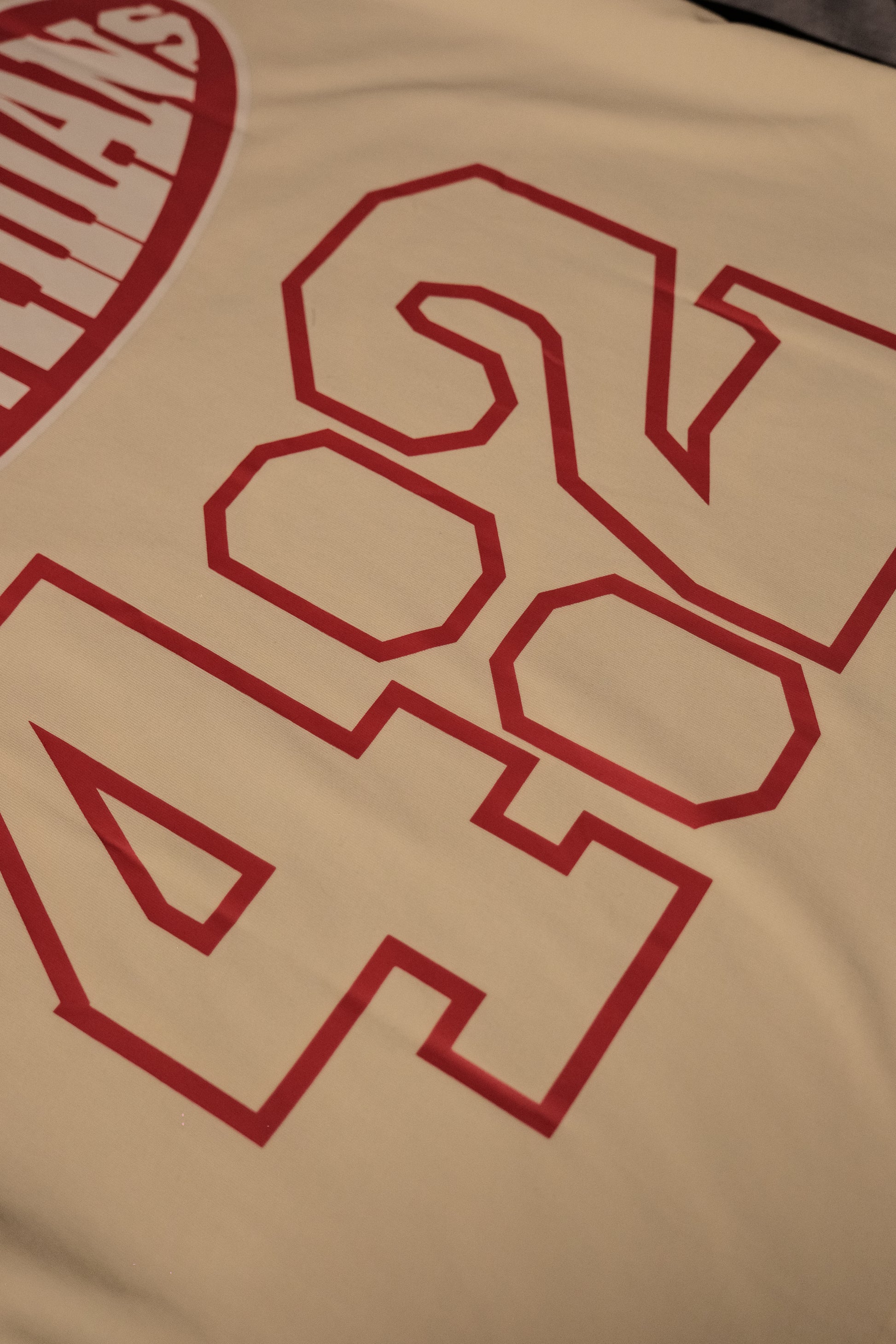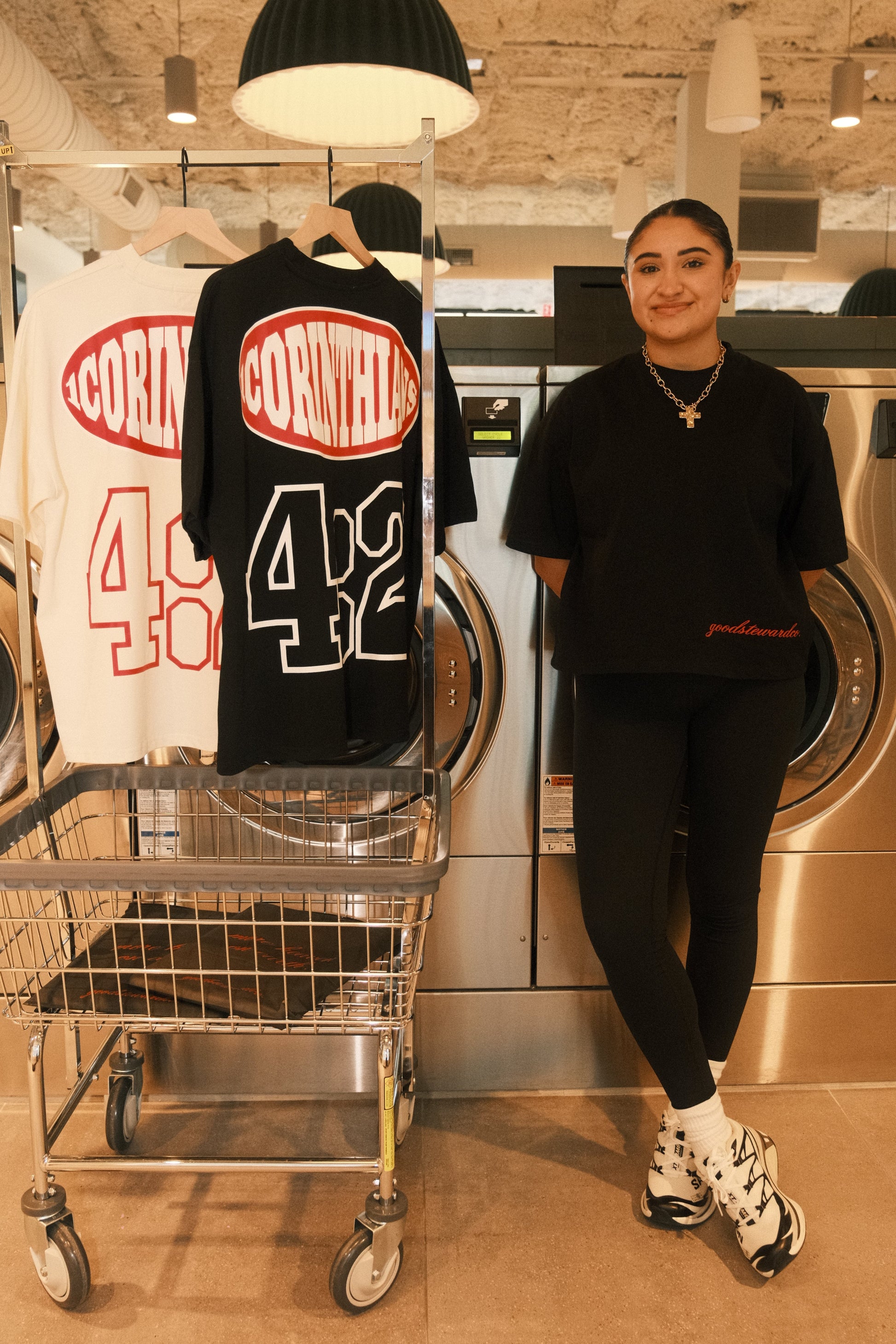 The front hem is detailed with tonal goodstewardco. script branding. The back is finished with a bold 1 CORINTHIANS 4:2 graphic, screen printed with a vintage athletic sensibility.